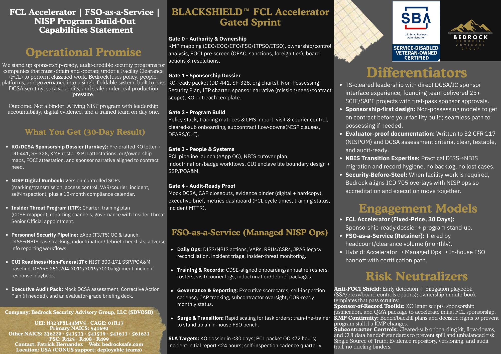 We design for first-pass sponsor acceptance using gated sprints (FCL → NBIS → Accreditation) and evaluator-proof artifacts mapped to 32 CFR 117 and ICD 705. Every build is governed by a Single Source of Truth, version-controlled policies, training, and evidence, backed by SLAs (cycle time to FCL, incident MTTR, self-inspection cadence). Anti-FOCI controls, subcontractor flow-downs, and train-the-trainer handoffs come standard.