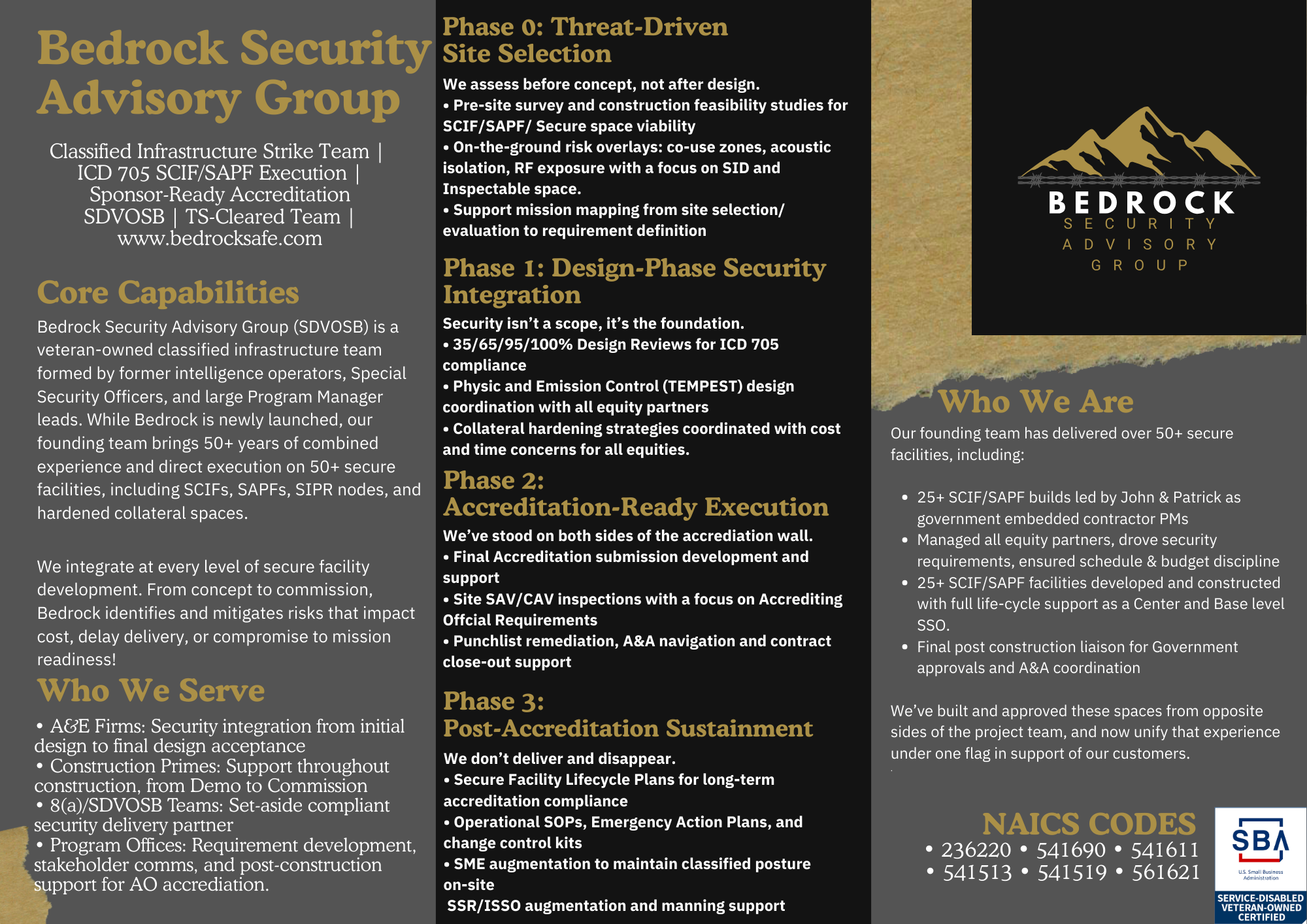 We turn secure-facility and security-program requirements into fielded capability. Bedrock designs, accredits, and sustains SCIF/SAPF and CUI environments under ICD 705 and 32 CFR 117 (NISPOM), integrating physical, technical, and procedural controls into one operating system. We deploy cleared teams who deliver first-pass sponsor acceptance, keep programs inspection-ready, and protect mission continuity when it matters.
